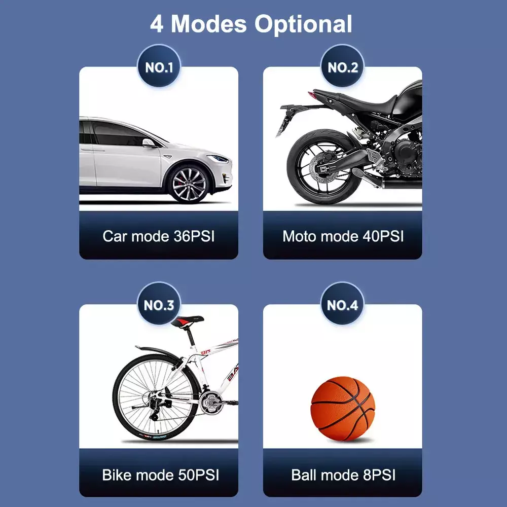 Até 150 PSI para carro, moto, bike e bolas — versatilidade de verdade.
